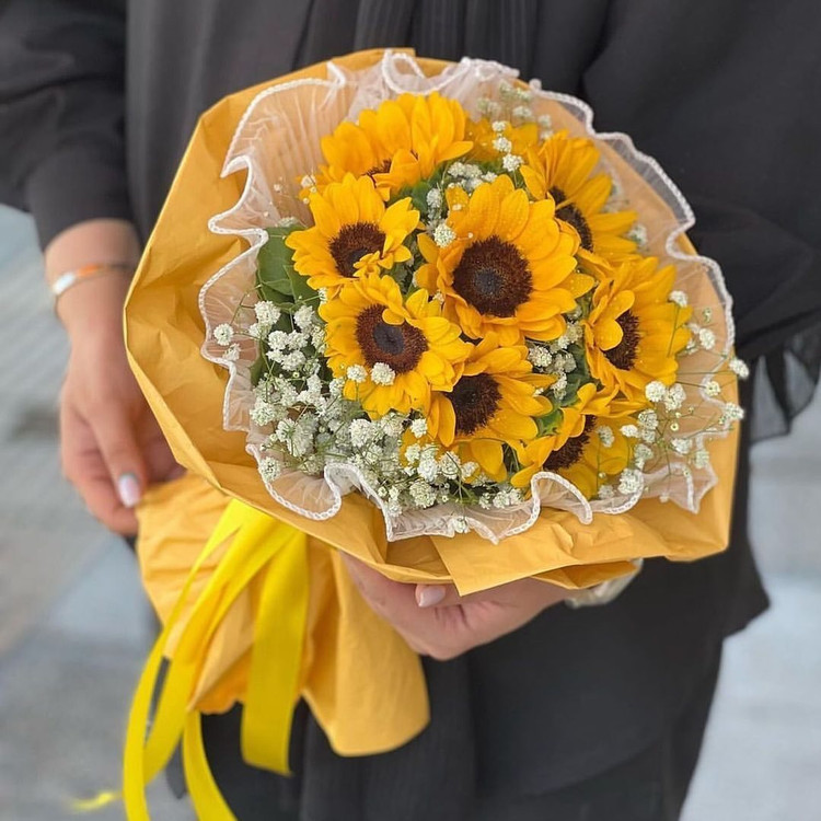 ترکیب گلها: آفتابگردان تازه و ژیپسوفیلا سفید