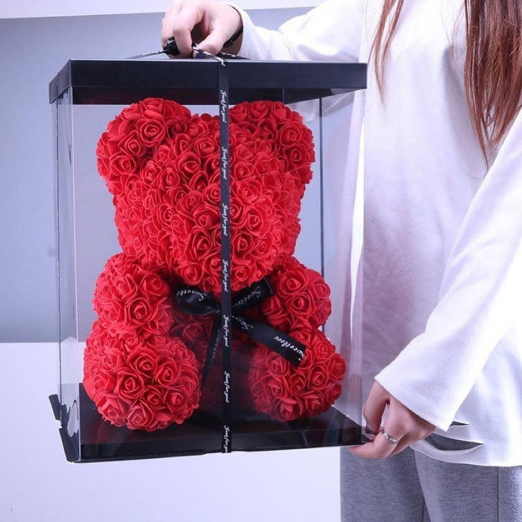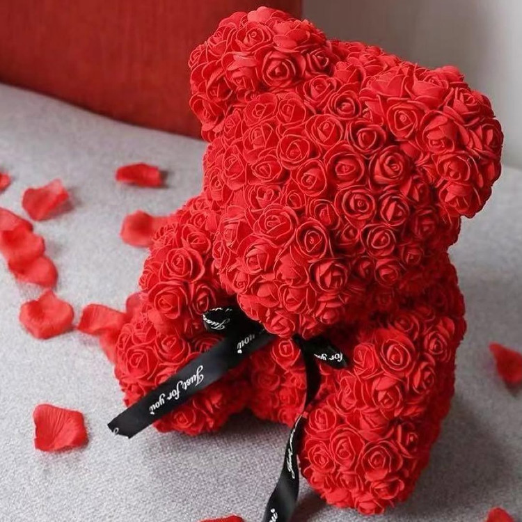این خرس زیبا از دهها رز فومی باکیفیت بالا ساخته شده که ظاهرش کاملاً شبیه گل طبیعی است اما هرگز پژمرده نمیشود.