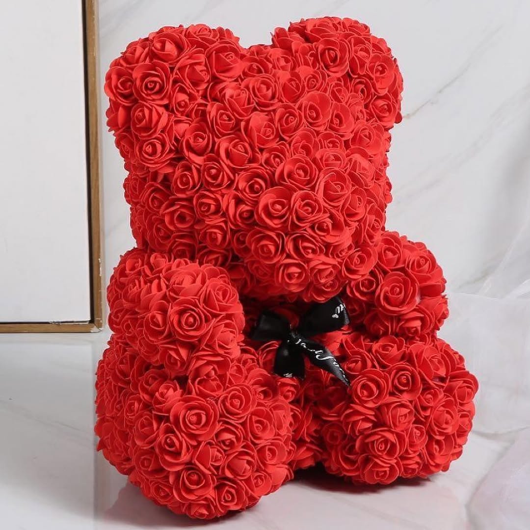 این خرس زیبا از دهها رز فومی باکیفیت بالا ساخته شده که ظاهرش کاملاً شبیه گل طبیعی است اما هرگز پژمرده نمیشود.